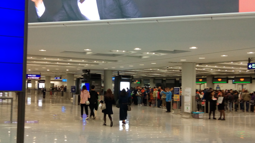 今回はパスポート更新後初めての香港なので、e道のPermissionを新パスポートに付け替えることも目的でした。旧パスポートの裏面についていたe道のバーコードで入港できるのですが、更新時に面倒なことになるようなので普通の列に並びました(行列の人は適度にボケてよかったw)