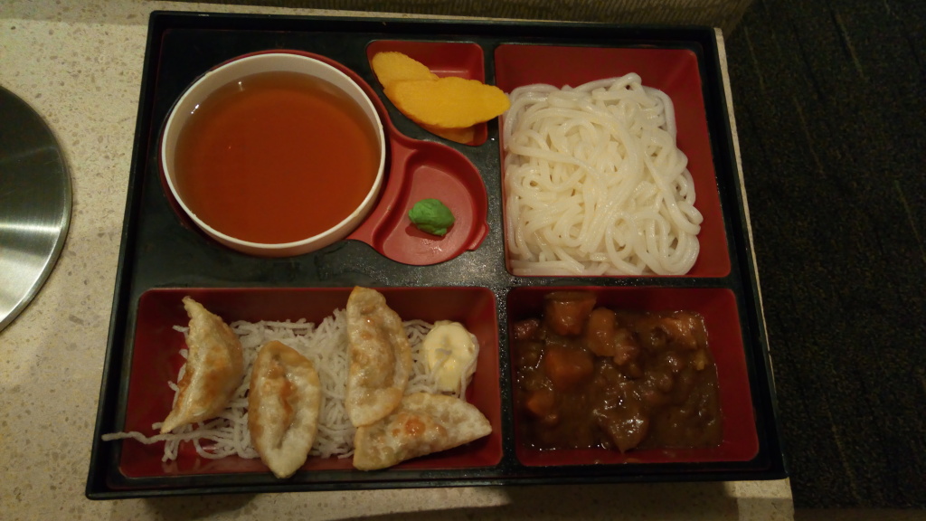 お昼になったので飯食いに来たわけですが、何食べようか迷っていたらラウンジのおばちゃんが「日本人はこれ頼む人多いよ」と声をかけてくれて、うどんと餃子と右下は何だったっけ?