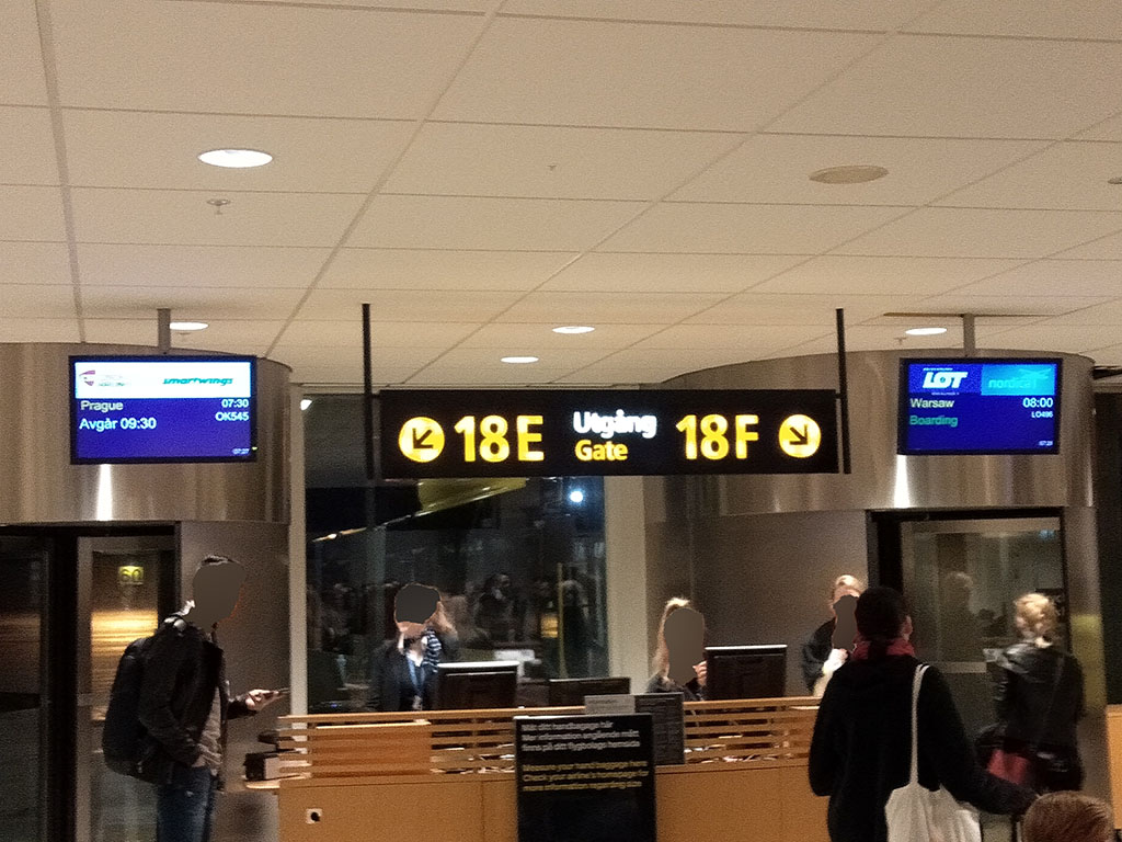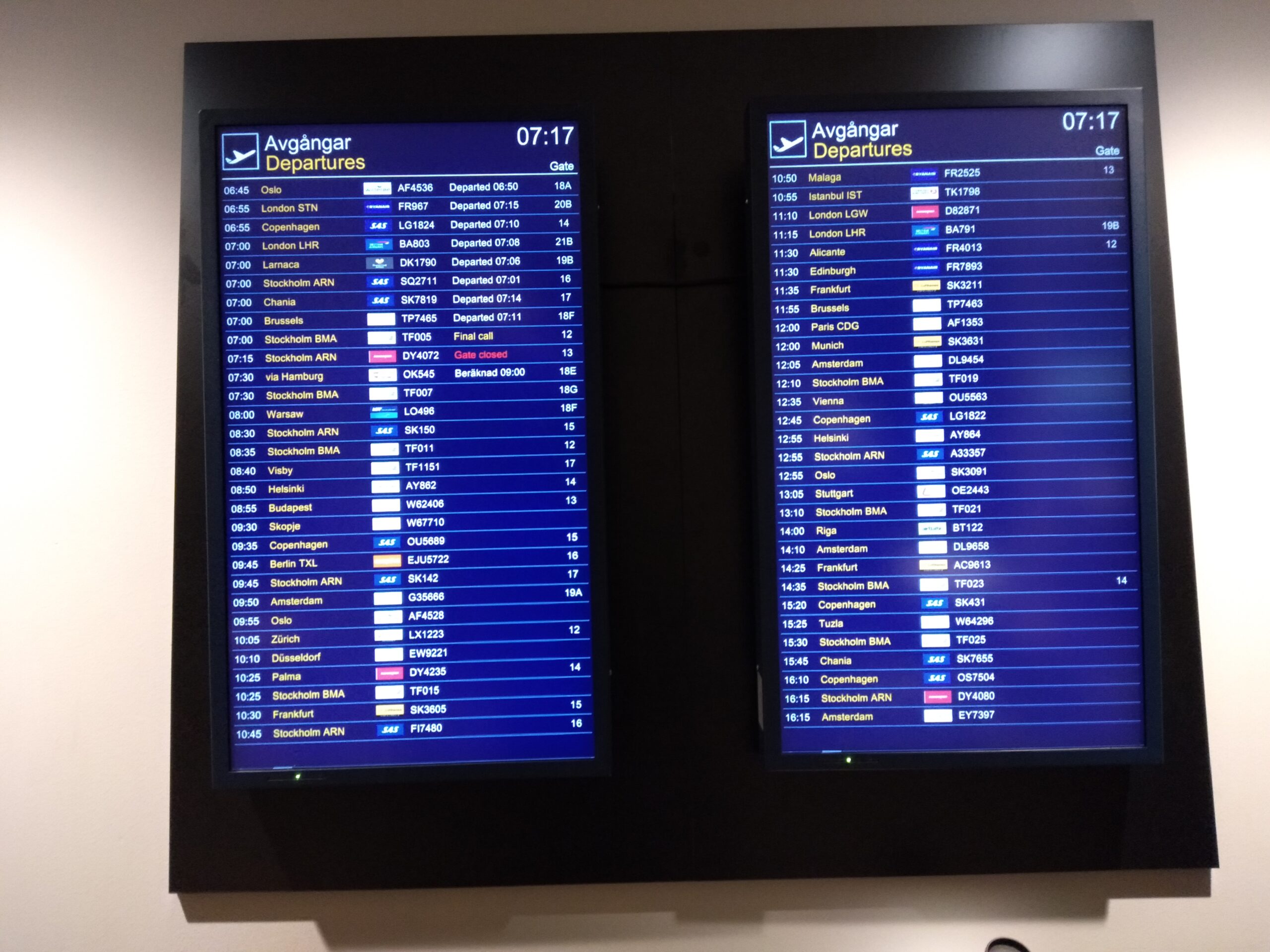 国内線と国際線(シェンゲン内、外)全部書かれています(ちなみに Stockholm BMAはストックホルム・ブロンマ空港のことで、BRA(Braathens Regional Airways)が利用します。