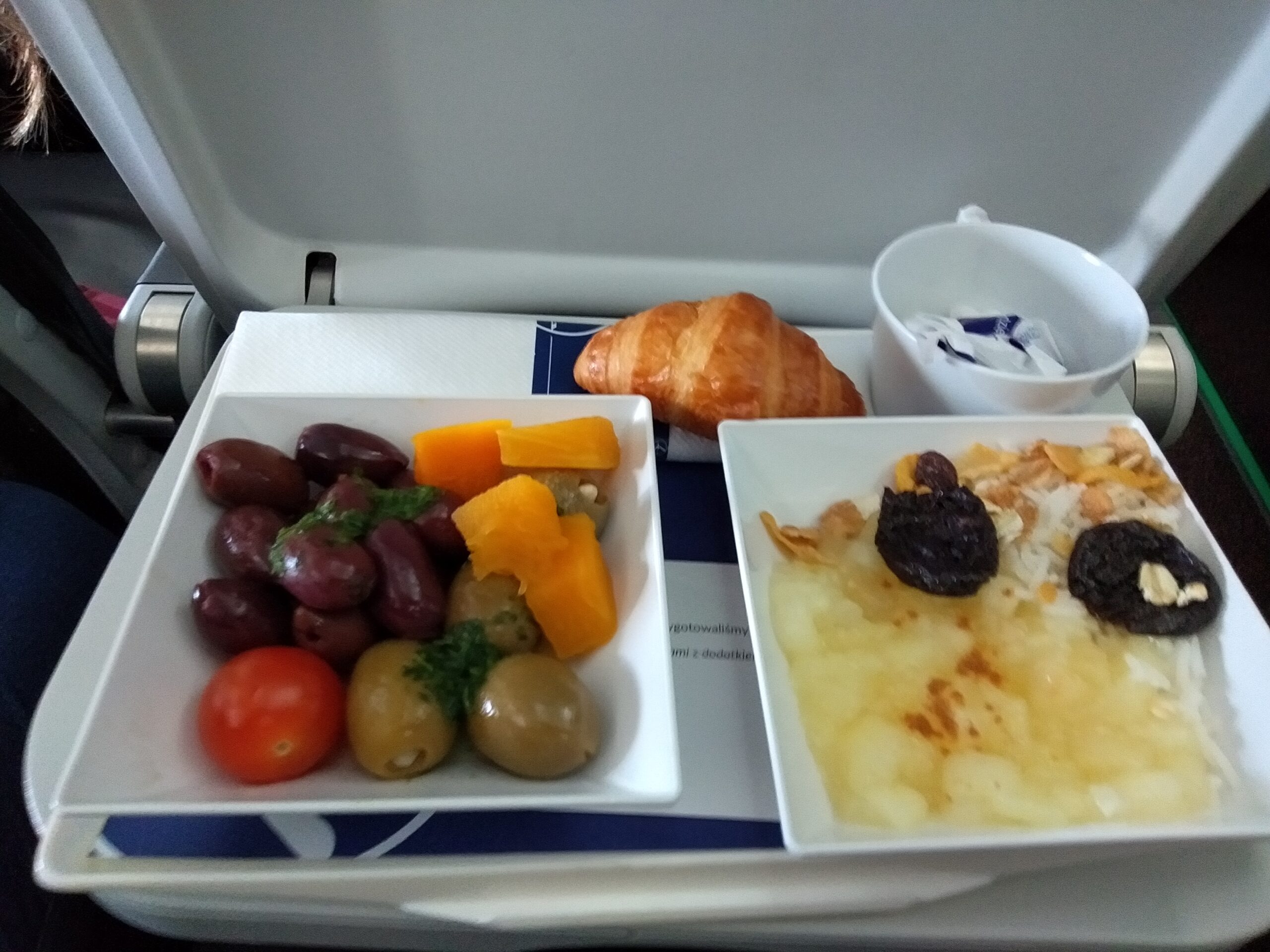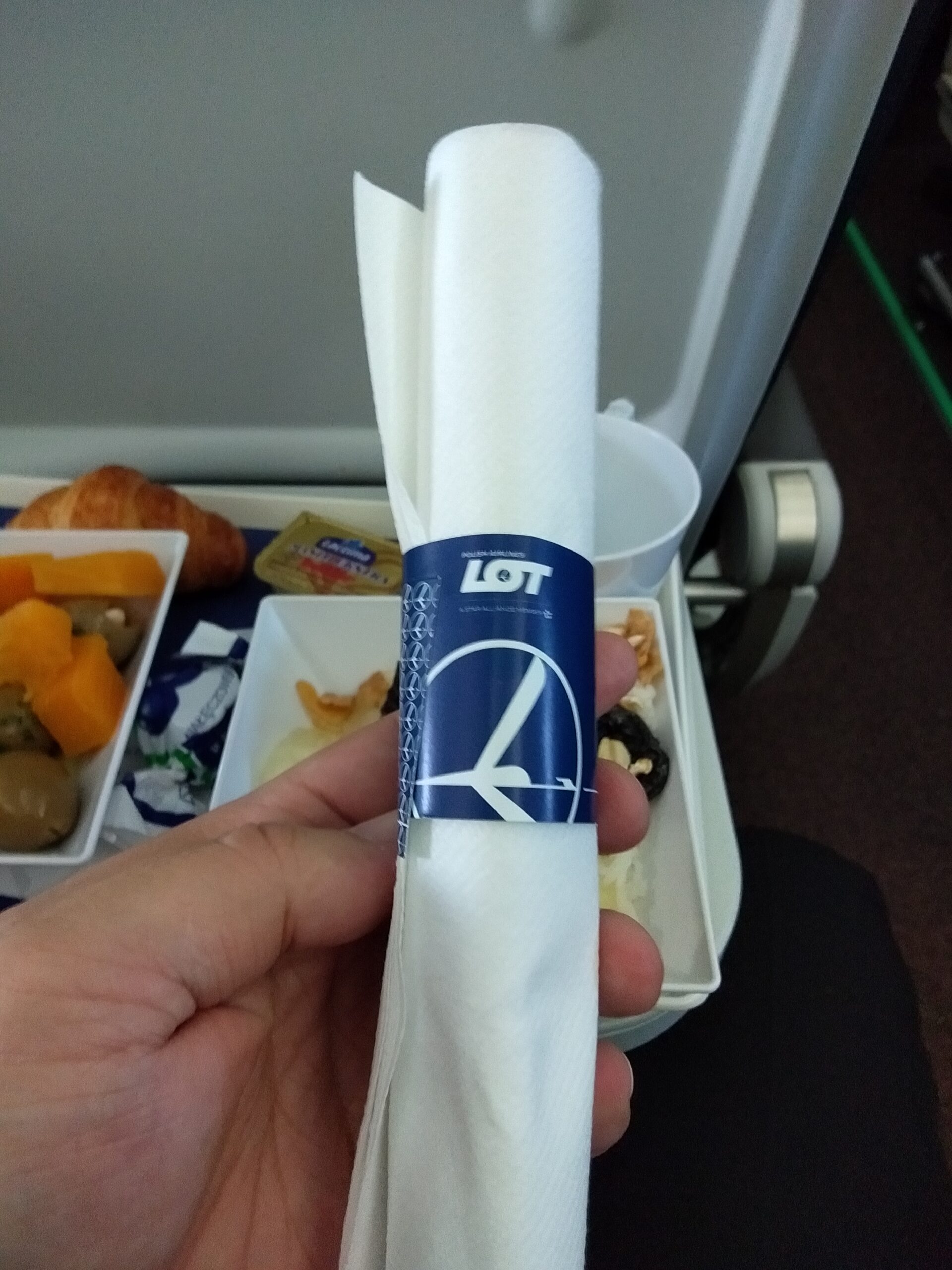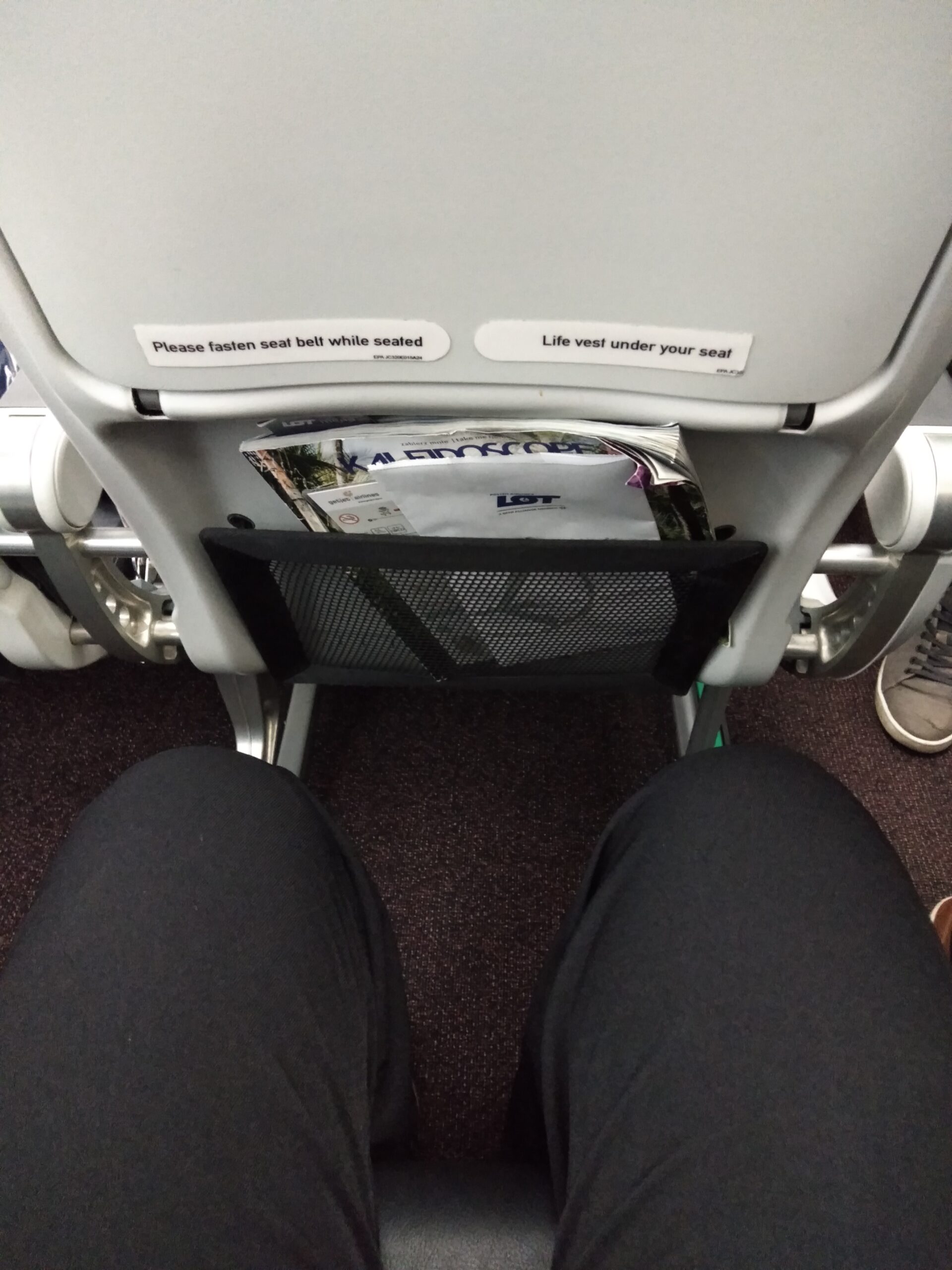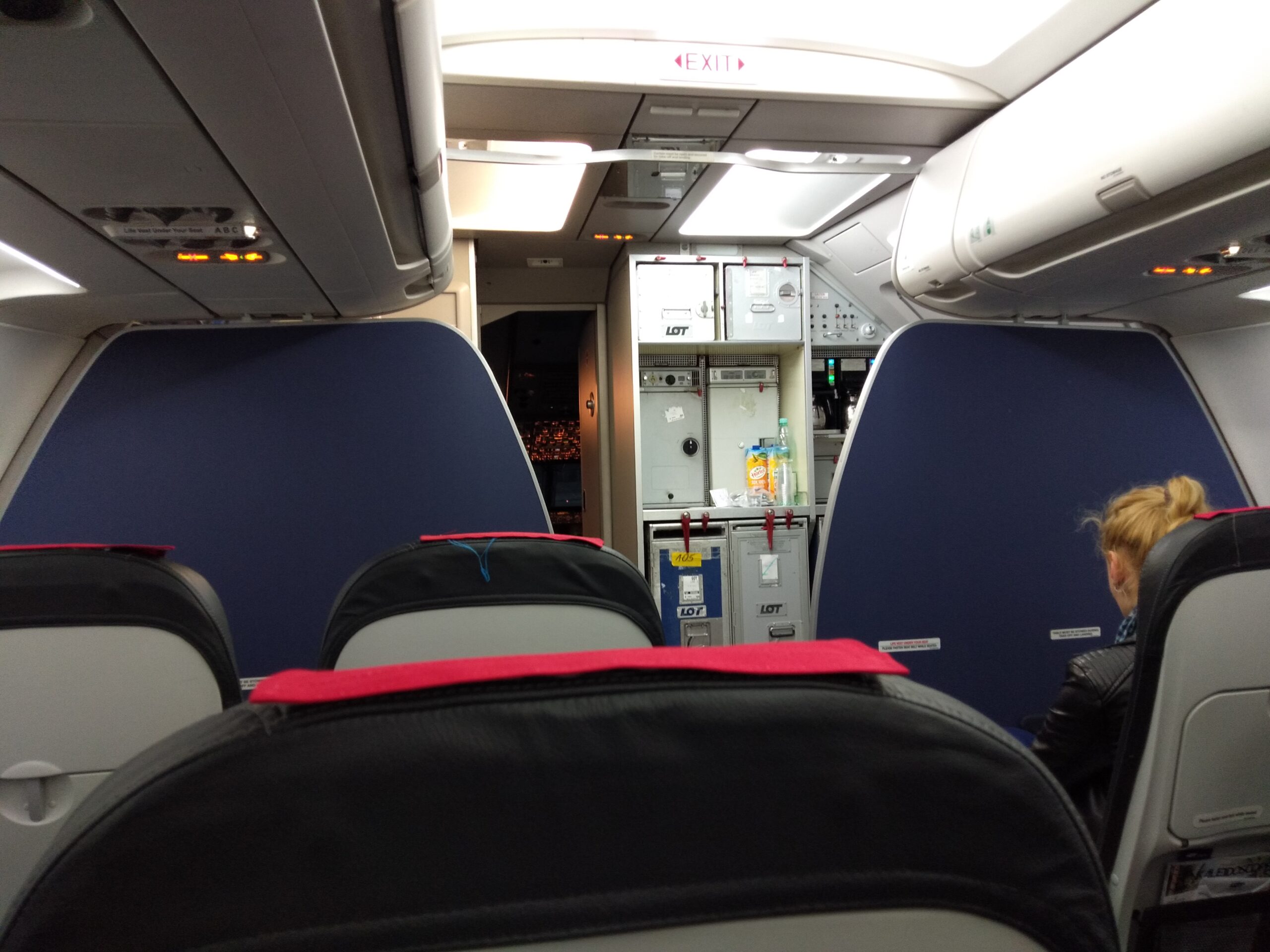 座席は、先頭2列がビジネスクラス(赤のシートカバー)、拙者が座っている座席ともう1列がプレミアムエコノミー(濃い青のシートカバー)、以降はエコノミークラス(水色のシートカバー)という風に分かれていました。そう、この時はまだLOの欧州域内便にはPY設定があったのです。