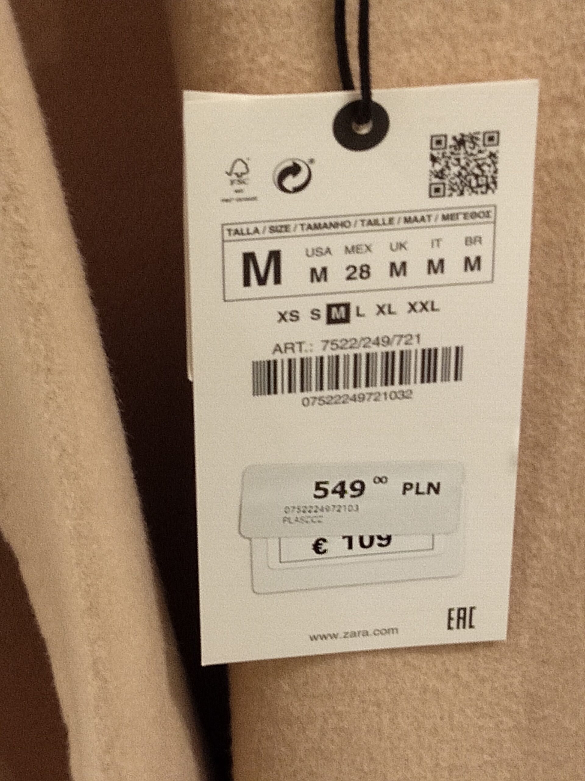 7522/249/721 か(コート)。末尾の03はMサイズという意味で2がチェックサム。この写真を一部の集団に「手に持つと重いw」と送ったら「(ピッキングの)仕事するなwww」と返信が来た覚えがあります(当時は週末だけこちらの通販出荷現場のお手伝いをするおじさんでもありました)。