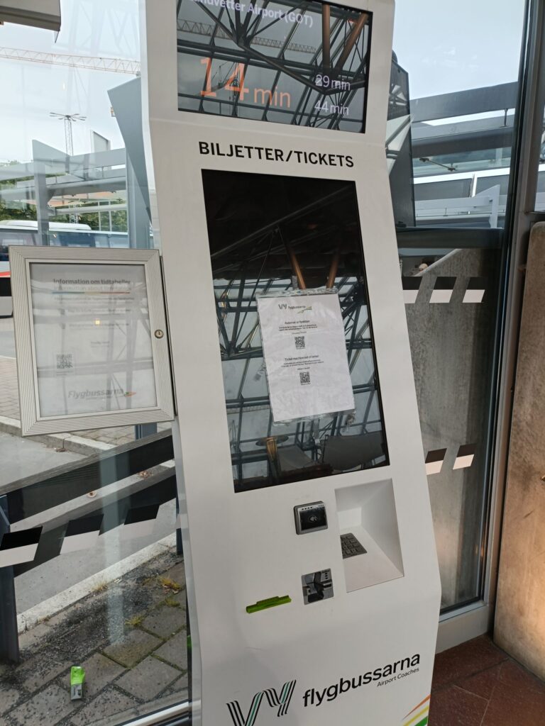 空港連絡バス。いつものように乗車券はイェーテボリ到着時にスマホアプリから往復購入していたので問題はないが、Nils Ericson Terminal に置いてある券売機は故障中。6月に乗ったときは稼働していたんだけどね。