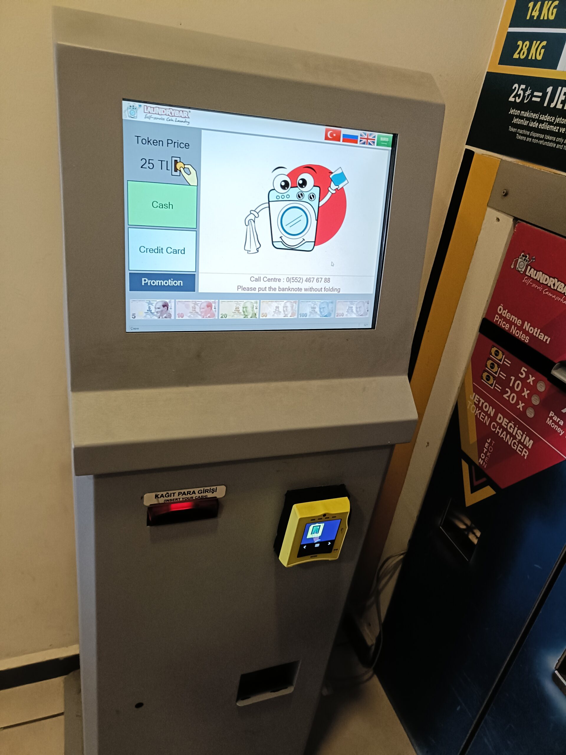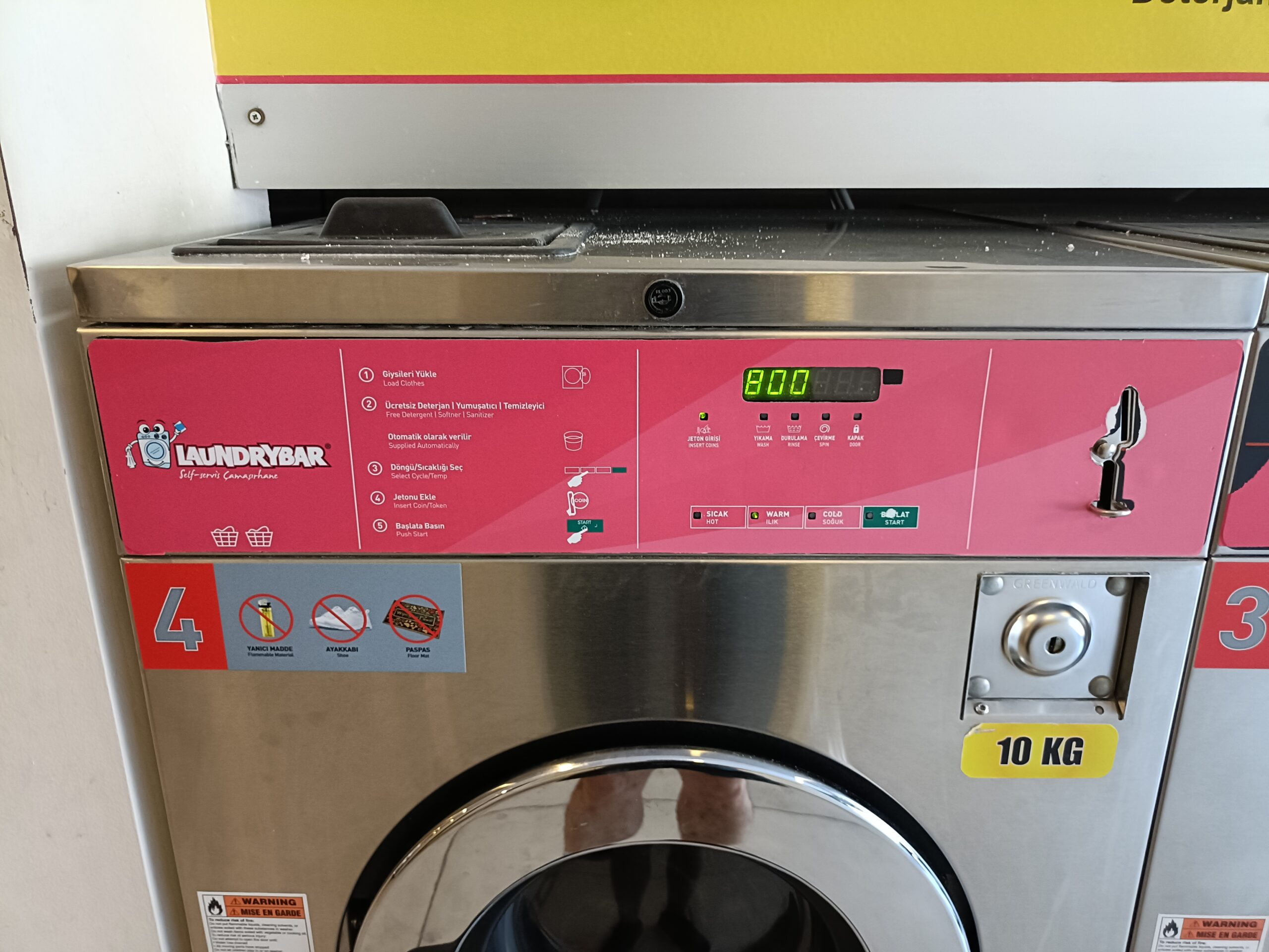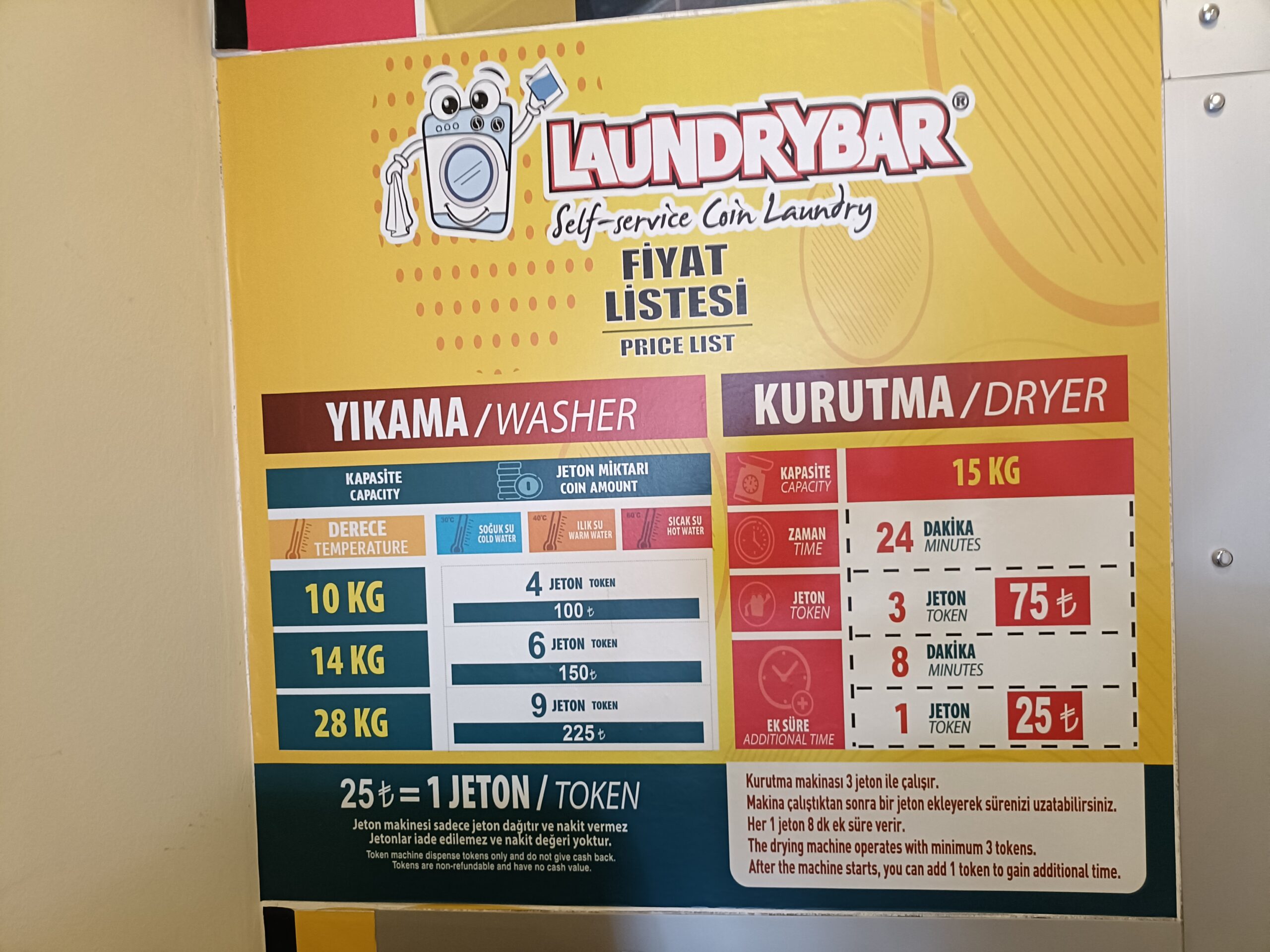 10KG洗いだとトークン4枚(100TL)、乾燥は1トークンで8分。24分乾燥だと3トークン必要なので、洗濯から乾燥までに必要な最低トークン数は7枚。この時の為替レートは覚えていませんが、日本よりも安いです。