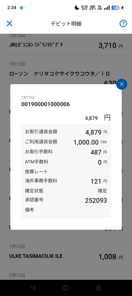 露天なのでカードとか使えるわけがないので住信SBIネット銀行のプラチナデビットカードを使ってキャッシング(だけど実際は口座から引き出し)としてAKBANKのCDで現金を払い出しました。レートと取扱手数料は以下の通り。お取引手数料は払出額の10%をAKBANKから請求され、海外事務手数料はデビットカード側が取る手数料です。取引手数料が無料の銀行はあったはずなのできちんと探しておけばよかったなぁ・・・