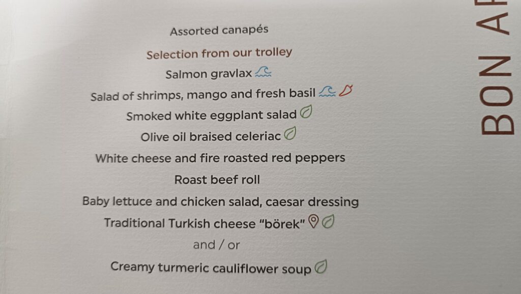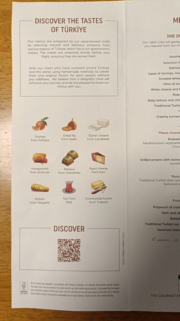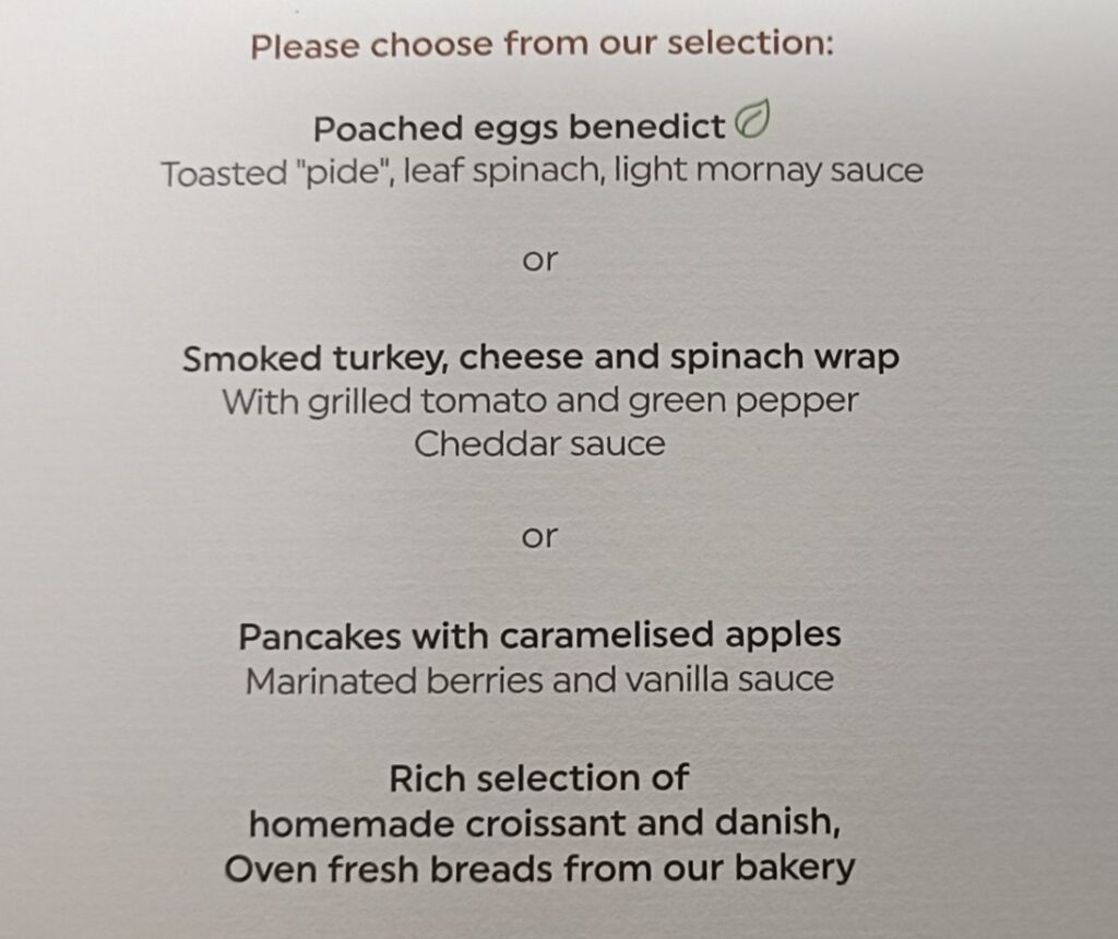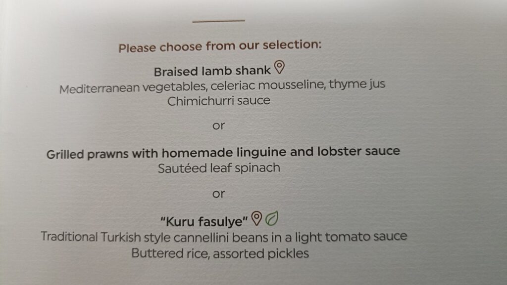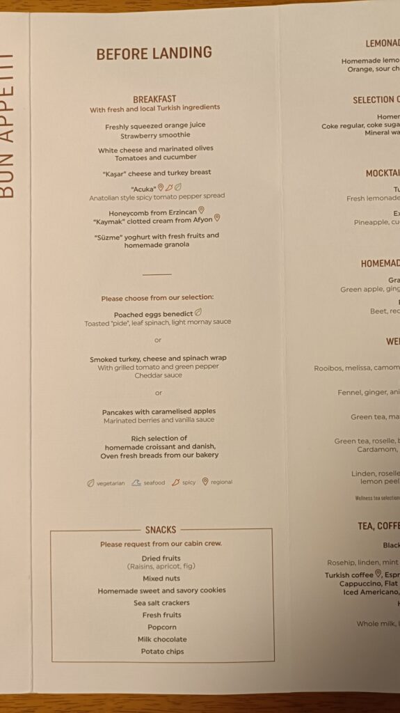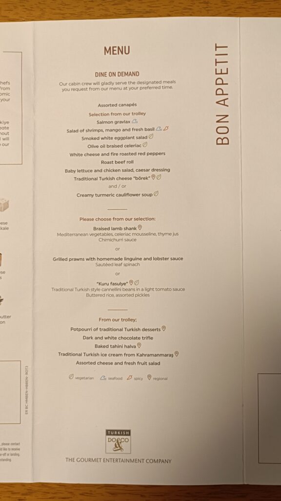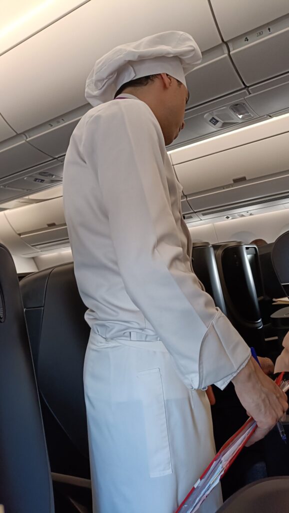 この便はフライングシェフが離陸後の食事のメインディッシュの伺いを立てに来ます(朝食のリクエストは取りません)。