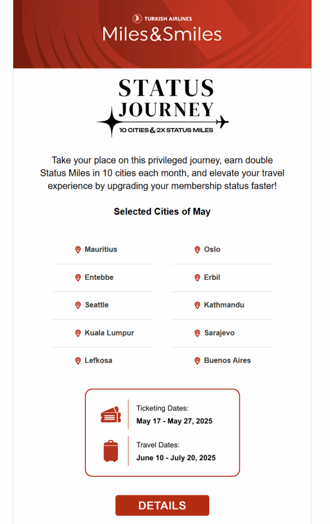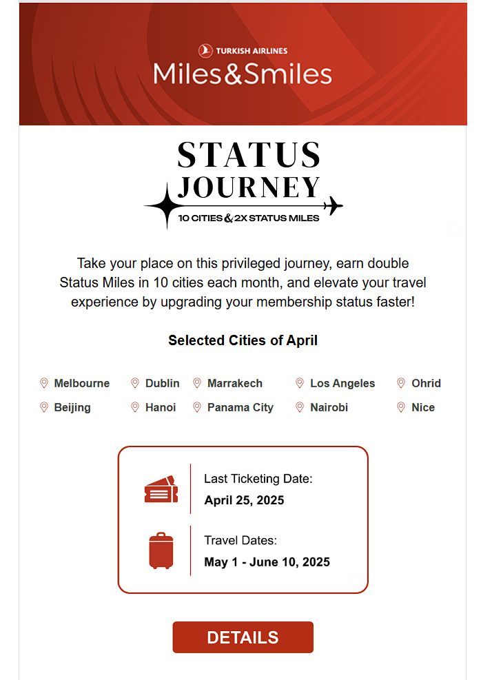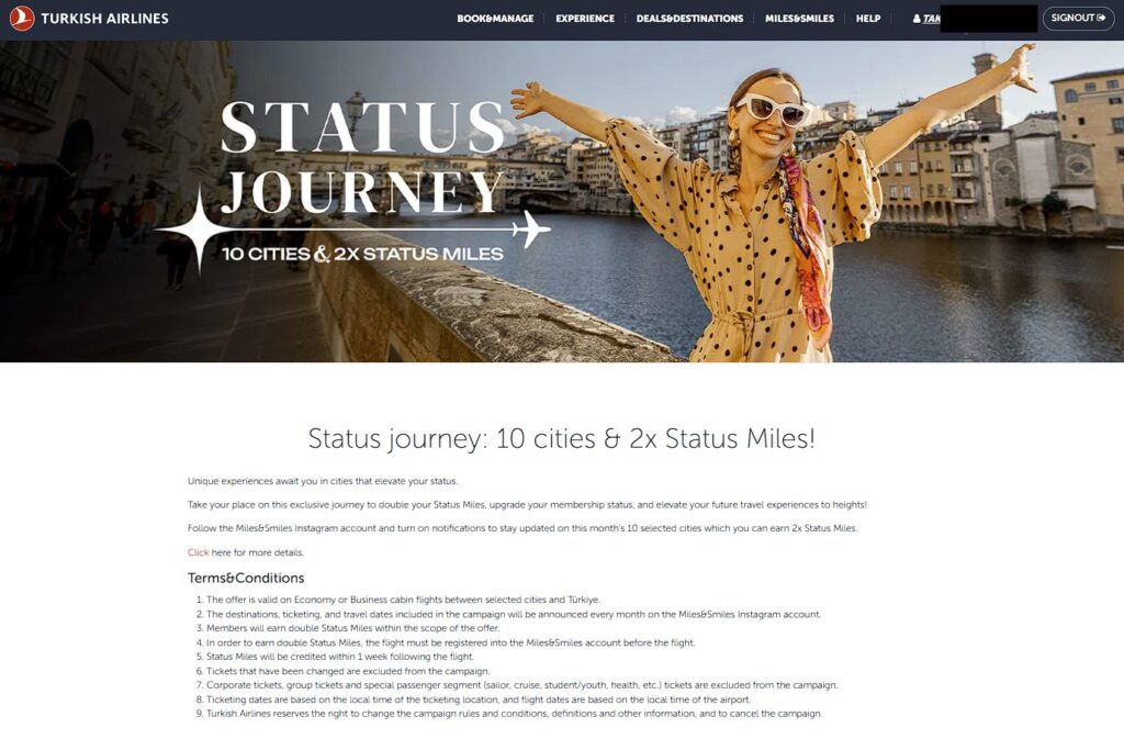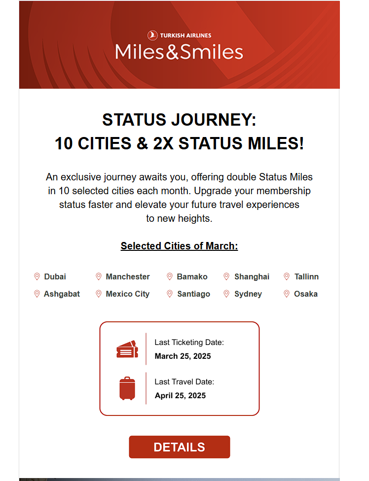 2025年3月から、毎月15日頃にトルコとTKが指定した10都市間のフライトで獲得できるステータスマイルが2倍になるというプロモが始まっていました。