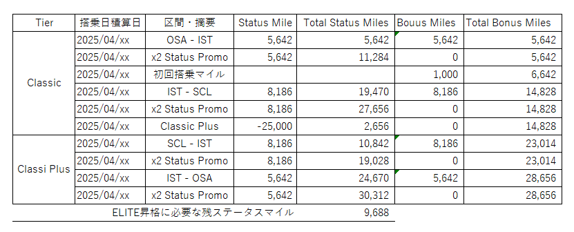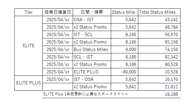 なお、ELITE昇格に必要な残ステータスマイルはClassic Plus昇格基準を超えたフライト搭乗日(IST→SCL)の翌日から1年間で計算します。
