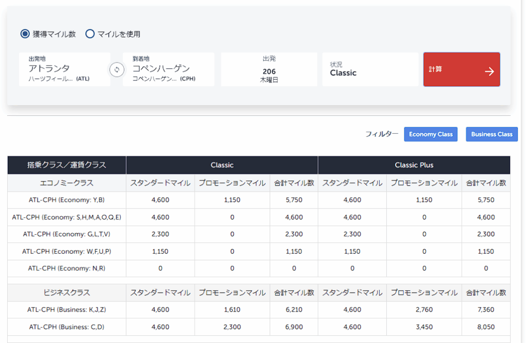 出発日は適当、状況はTKのステータスを設定するところですが、TPM調べたい場合はそのままClassでよいです。ATL-ARNの検索結果は以下の通りJALのマイル計算機と同じ値が出ます(TPMは上から1番目2番目に表示されているスタンダードマイルの値が該当します)。